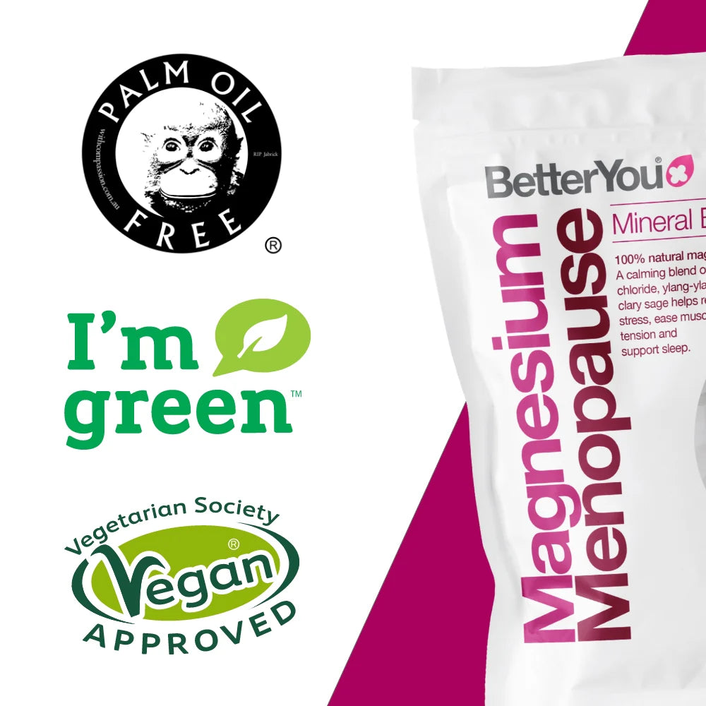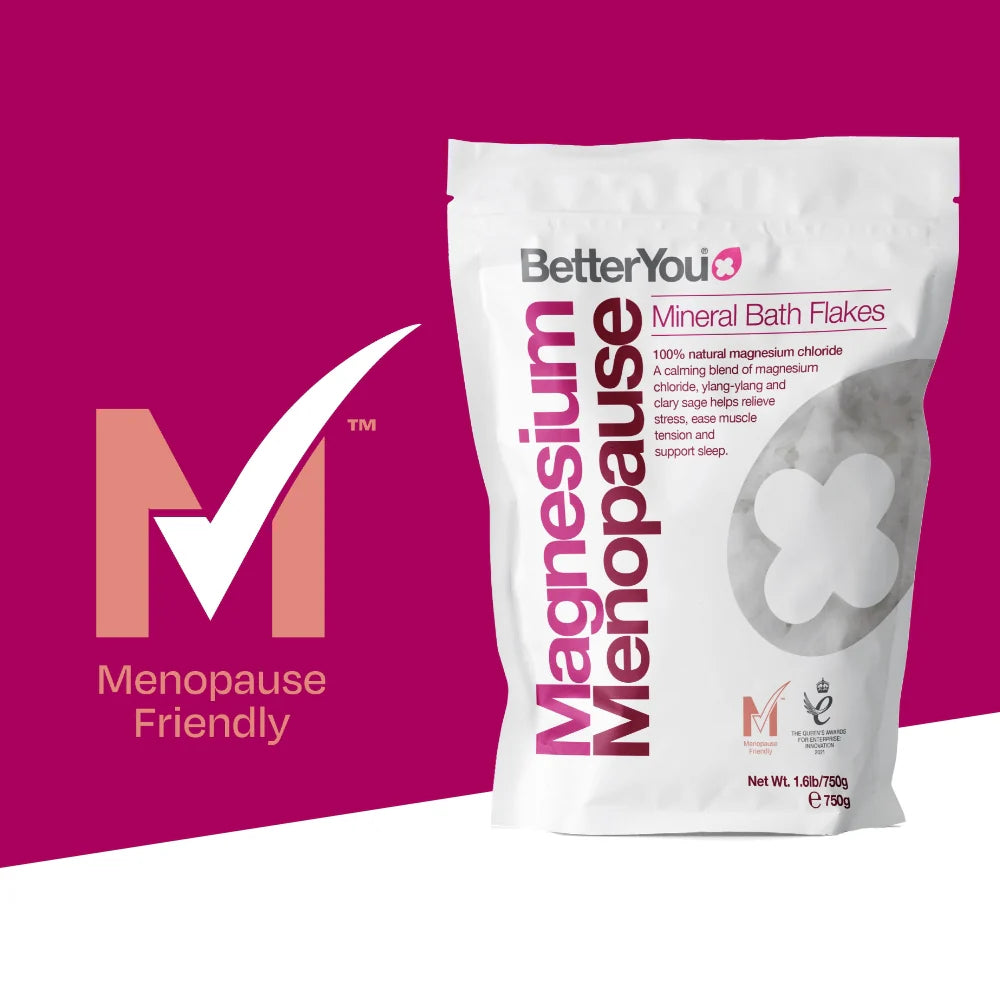 BetterYou Magnesium Menopause Bath Flakes provide a calming blend of magnesium chloride, ylang-ylang and clary sage. Helping to relieve stress, ease muscle tension and support sleep.